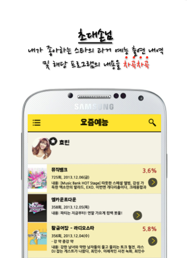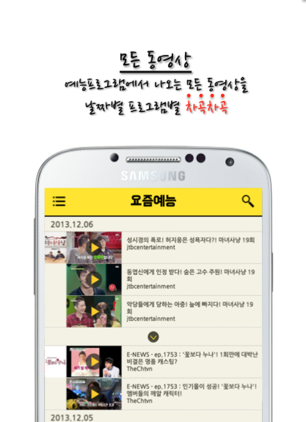 대한민국 예능 프로그램들에서 생산되는 하이라이트 동영상을 프로그램별로, 게스트별로, 회차별로 차곡차곡 정리를 해주는 앱입니다.